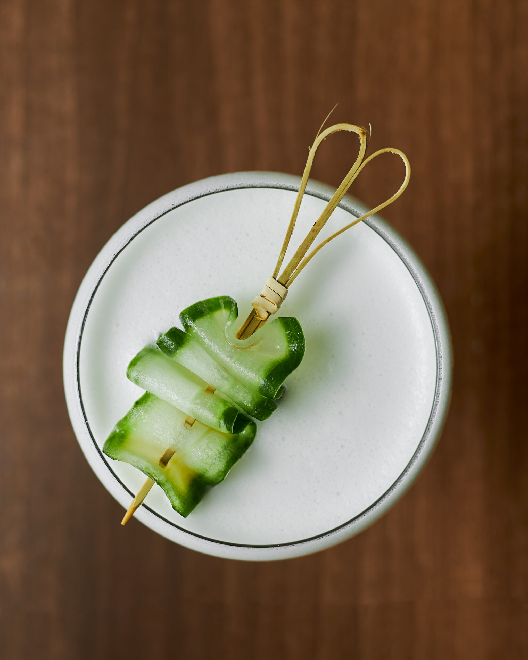 Gin, fresh cucumber, elderflower syrup, simple syrup, lime juice, simple syrup