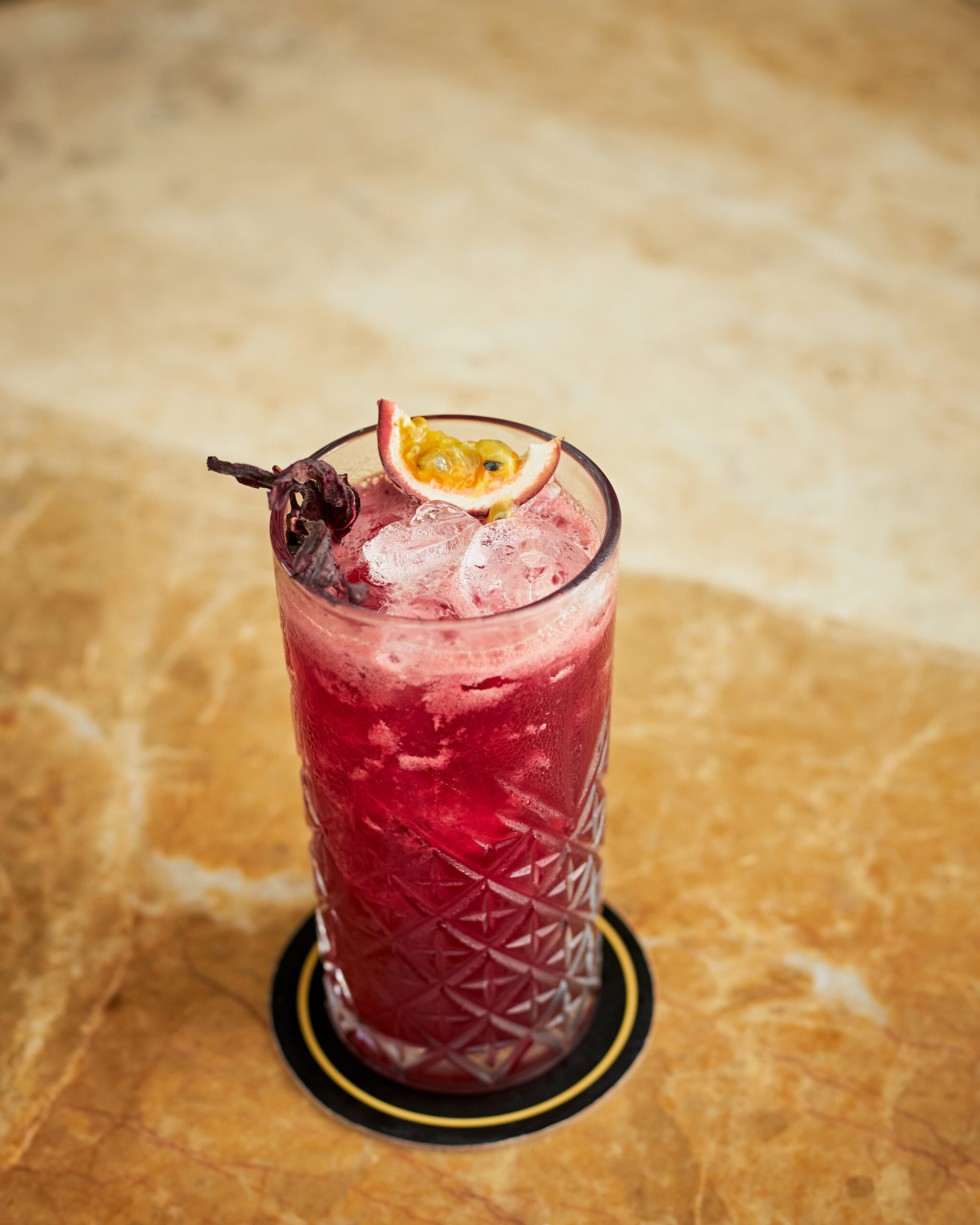 Tequila, hibiscus juice, passionfruit puree, allspice liqueur, lemon juice